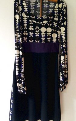 This dress was made to solve the problem of clothes becoming too tight with age... both the original dress and the skirt were too close-fitting. The solution has been to remove the skirt’s belt but add an elastic one, then moving the skirt’s belt up to the part of the body where we are thinner and finally putting the two pieces together after having cut the dress.