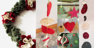 Guirlandes, boules pour l’arbre, une couronne... tout est possible avec seulement quelques pulls en laine feutrée, quelques boutons et du fil !